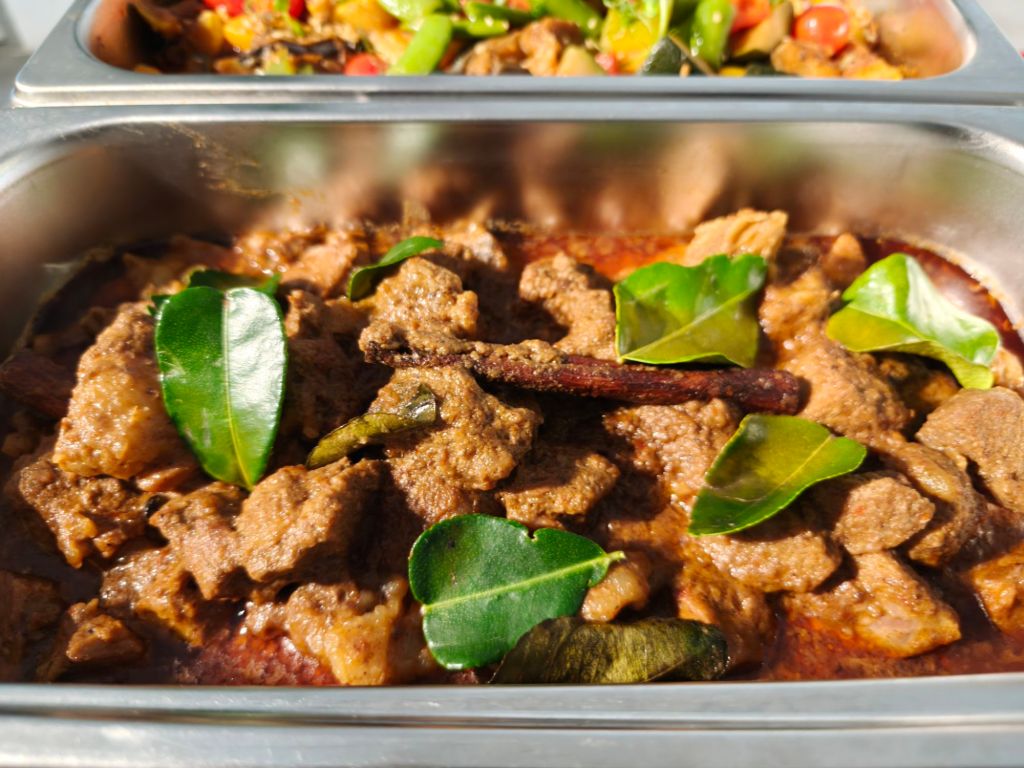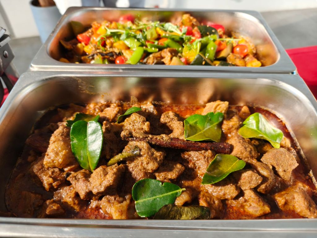 Main courses of beef rendang, sweet and sour fish and lemongrass chicken.