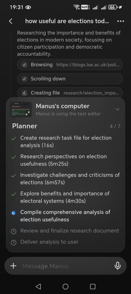 Manus tells me that it can do research and compile research reports, do data processing and data analysis, write in depth articles, reports and research papers with citations, create websites and web applications, help automate workflows and navigate websites and fill out forms.