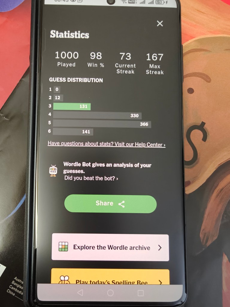 Today I completed my 1000th Wordle. This game was developed by a Welsh web developer and bought over by NYT in Jan 2022.