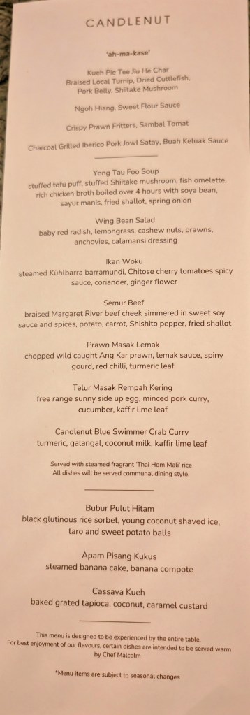 I picked Candlenut at Dempsey because the food is decent and they have a set dinner menu. Also they could give me their private dining room.